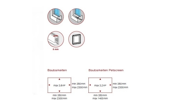 Die Profilstärke des Insektenrahmen beträgt 8 mm. Einbaumaß 9 mm. Eine Mittelsprosse wird über 120 cm Höhe / Breite verbaut.