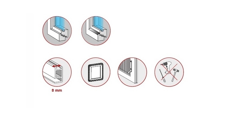 Die Profilstärke des Insektenrahmen beträgt 8 mm. Einbaumaß 9 mm. Eine Mittelsprosse wird über 120 cm Höhe / Breite verbaut.