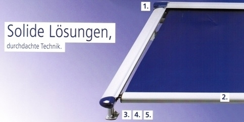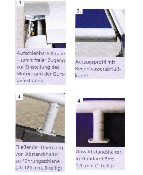 - ab 401 cm Ausfall, wird ein horizontaler Windlastträger unter dem Stoff verbaut (verhindert Stoffdurchhang)
