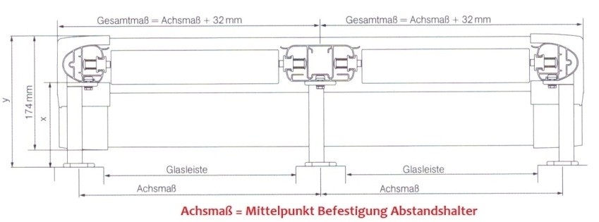 Kopplungsmaß gemessen von der Antriebsseite aus von Außen auf den Wintergarten (Hauswand) draufschauend gesehen in cm.