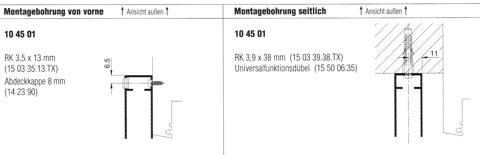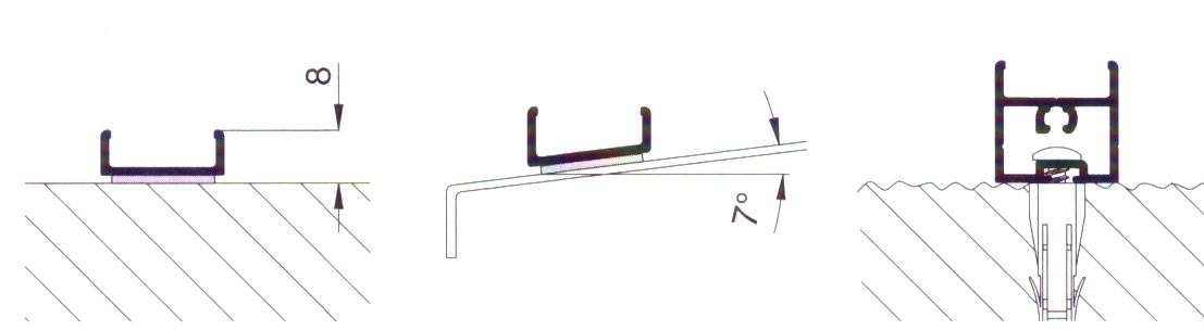 Es stehen drei verschiedene Endschienen zur Verfügung. Eine selbstklebende ultradünne Endschiene (Schwarz oder Silber) mit nur 8 mm Bauhöhe, eine 8 mm mit Neigungswickel 7 Grad für schräge Flächen und eine 19 mm aufschraubbare Endschiene (Rahmenfarbe angepasst).