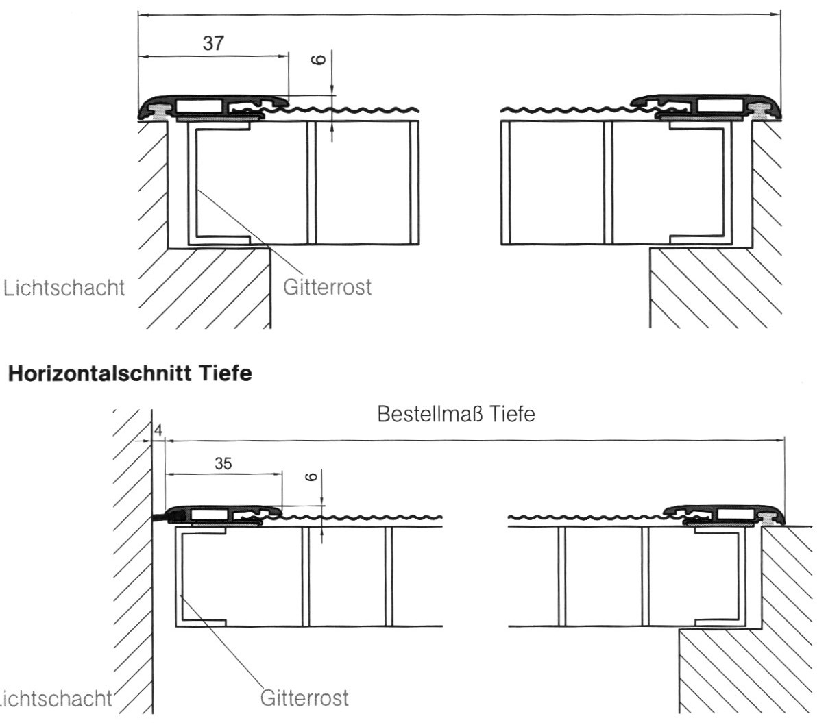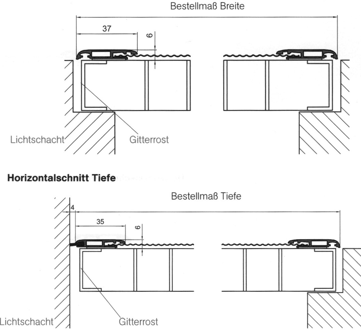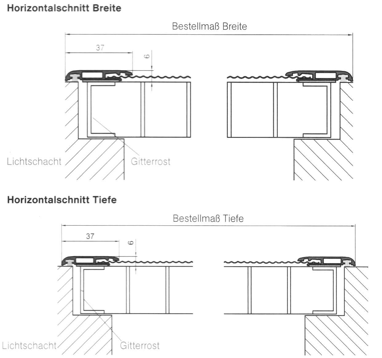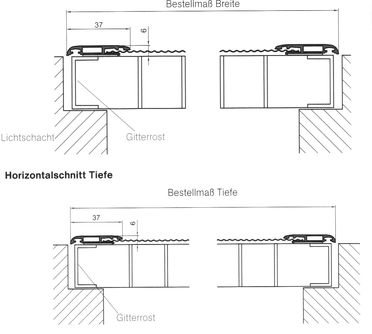 Dabei wird zusätzlich unterschieden, ob die Abdeckung an allen 4 Seiten ohne die Bürstendichtung gefertigt wird oder die Lichtschachtabdeckung nur an 3 Seiten ohne Bürste und 1 x nach Hinten, Richtung Wand mit Bürstendicht angebracht wird.
