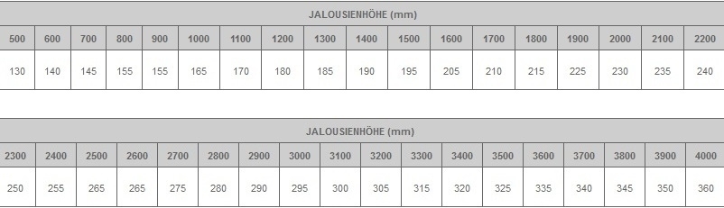 bis 100 cm Jalousiehöhe = 145 mm Pakethöhe bis 120 cm Jalousiehöhe = 150 mm bis 140 cm Jalousiehöhe = 155 mm bis 160 cm Jalousiehöhe = 160 mm bis 180 cm Jalousiehöhe = 165 mm bis 200 cm Jalousiehöhe = 170 mm bis 220 cm Jalousiehöhe = 175 mm bis 240 cm Jalousiehöhe = 180 mm bis 260 cm Jalousiehöhe = 185 mm bis 280 cm Jalousiehöhe = 190 mm bis 300 cm Jalousiehöhe = 195 mm bis 320 cm Jalousiehöhe = 200 mm bis 340 cm Jalousiehöhe = 205 mm bis 360 cm Jalousiehöhe = 210 mm bis 380 cm Jalousiehöhe = 215 mm bis 400 cm Jalousiehöhe = 220 mm Die Pakethöhen mit Kurbelbedienung sind um 20 mm kleiner. Die Abdeckbleche werden standardmäßig 25 mm höher als das Paketmaß gefertigt.