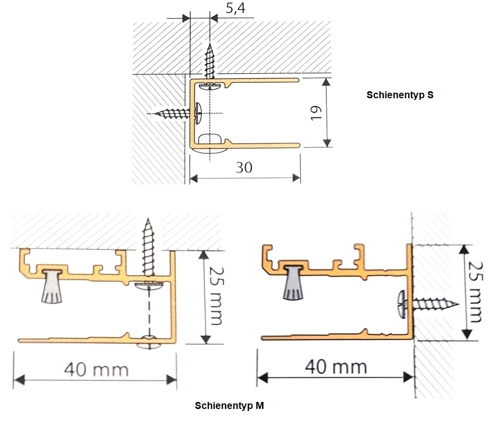 Typ M, Schienenmaß: 40 mm breit und 25 mm tief.