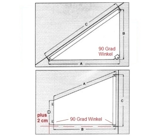 Die Grundflächenbreite ist bei 3- Ecken "A" und bei Trapezen "B", siehe Skizzen. Bitte beachten Sie, daß zum kleinen effektiven Stoffhöhenmaß D, immer 2 cm hinzugerechnet werden müssen. Die Rollohöhe "B" bei 3 - Ecken = Oberkante Rollo bis Stoffunterkante.