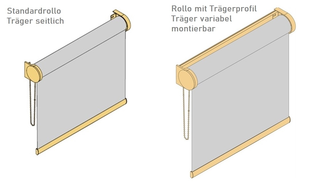 Sämtliche Bedienvarianten wie seitliche Endloskettenbedienung, Motor sind lieferbar. Alle Halterungen und Profilteile sind in weiss oder silbergrau lieferbar. Rechts = Rollo mit Trägerprofil. (gegen Aufpreis)